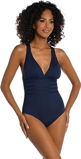 • DESIGNER SUMMER SWIMWEAR — Whether lounging poolside or snorkeling in the sea, this one-piece swimsuit is designed to keep up with your busy itinerary. Horizontal bands beneath the sexy v-plunge neckline define your waist.