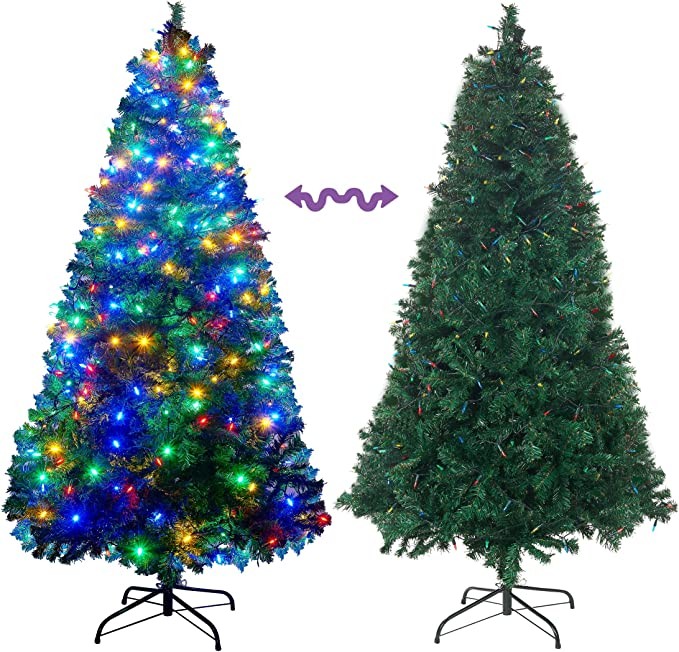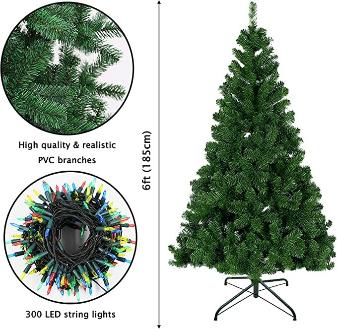 Lulu Home 6 Ft Artificial Christmas Tree with 300 LED Warm White String Lights (Not Pre-Strung) and 850 Branch Tips, 8 Lighting Modes Artificial Christmas Tree with Iron Stand